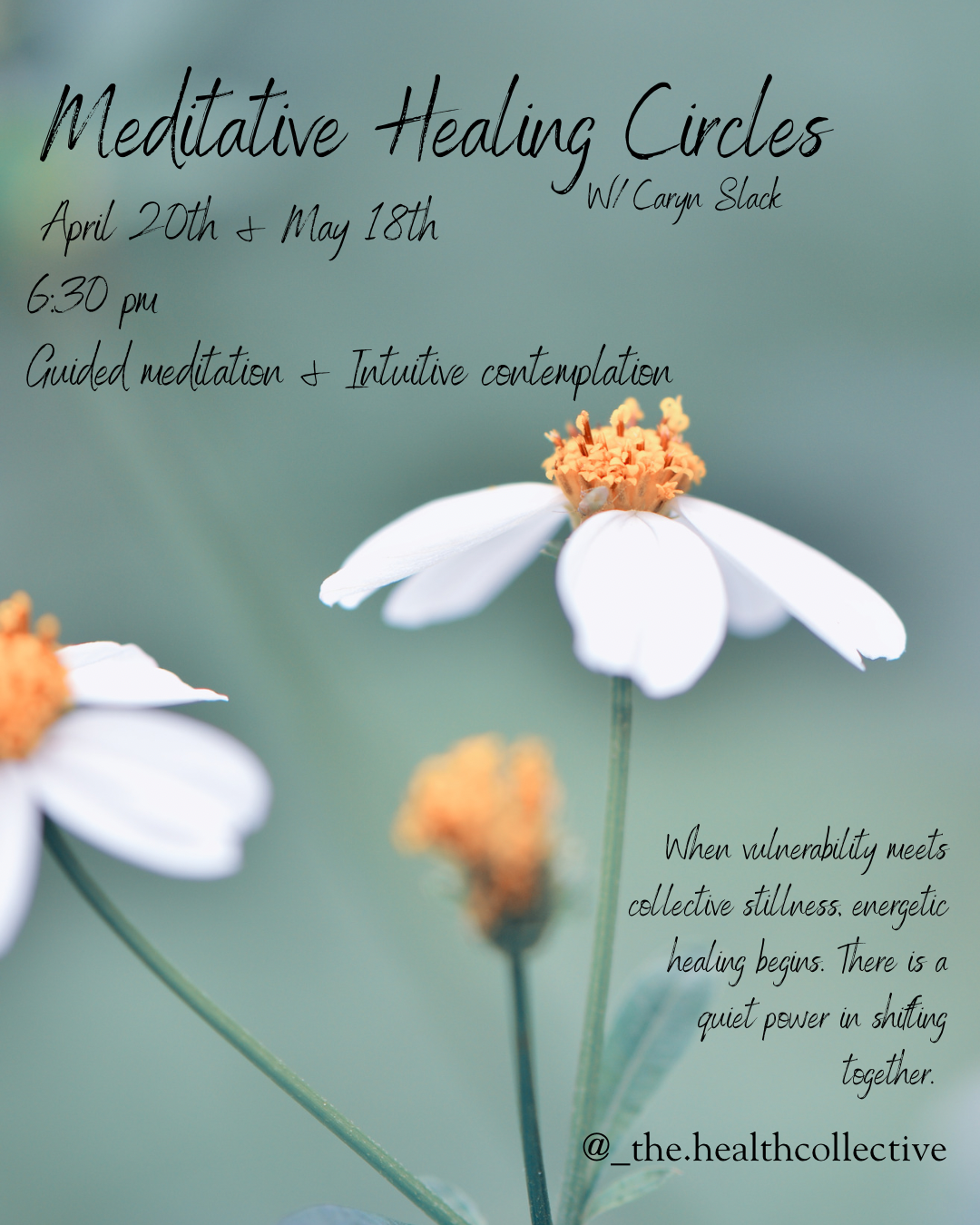 Be sure to look for group meditation and your prefered date when booking online. Or reach out to Caryn directly to schedule.